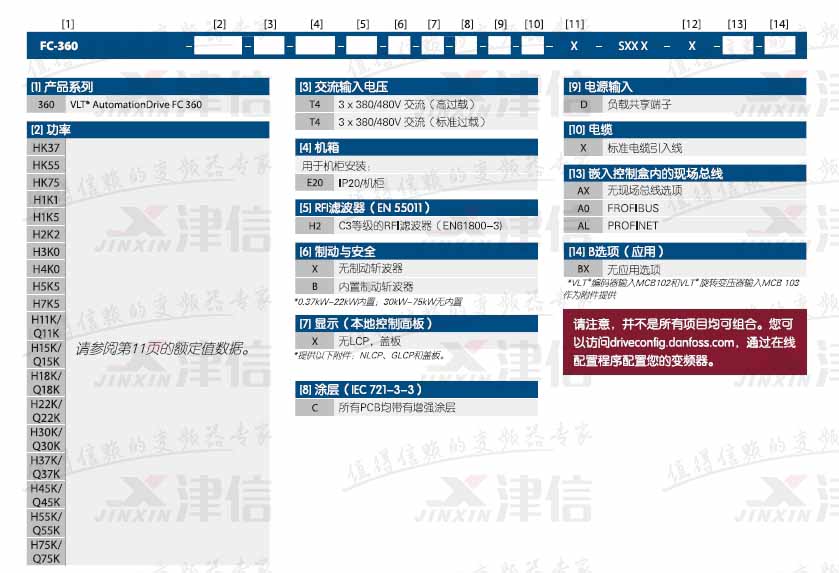 如FC360H1K5T4E20H2BXCDXXSXXXXALBX,代表380V,1.5KW,IP20,C3等級內(nèi)置濾波器,內(nèi)置制動,PROFINET現(xiàn)場總線
