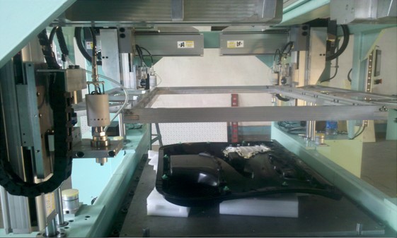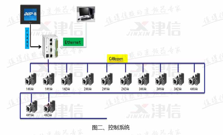 4頭超聲波焊機用于汽車內(nèi)飾焊接上,有4個獨立的焊頭,每個焊頭上有X、Y、Z三個運動軸。主要有回零、示教、焊點定位、及焊點測試等功能,設(shè)有焊頭防撞保護、光柵保護、伺服報警保護,設(shè)備暫停等保護功能。設(shè)備如圖一所示:
