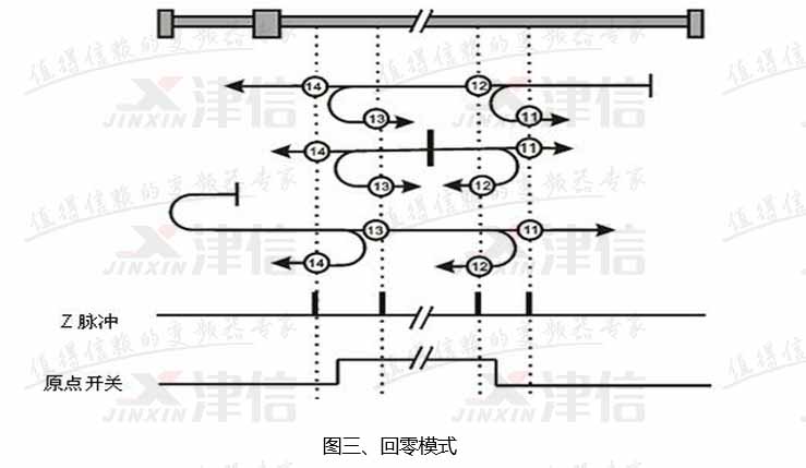 根據(jù)客戶要求,選擇的回零方式為:回零時反轉(zhuǎn),找到零位信號后,伺服開始正轉(zhuǎn),找到第一個Z相脈沖后再偏移一定的原點偏移量,回零方式如圖三所示。