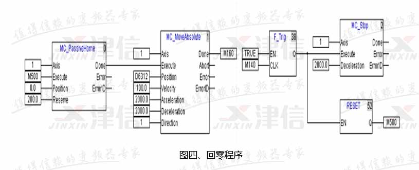 在執(zhí)行回零的過程中,如發(fā)生故障或按下急停,則調(diào)用“MC_Stop”指令來使當(dāng)前軸停止回零動作。程序如圖四所示:
